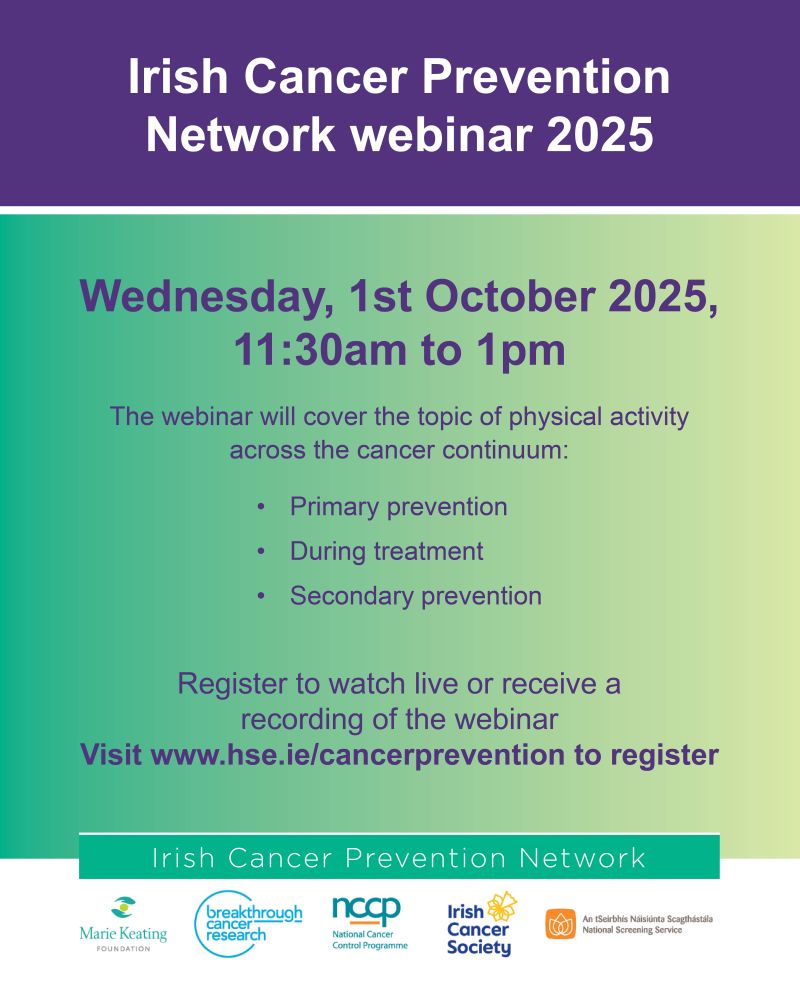 The ICPN annual webinar, Physical activity across the cancer continuum, takes place on Wednesday, 1st October 2025, 11:30am – 1pm (online, free to join).